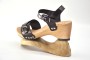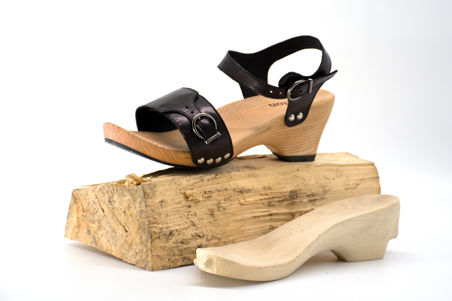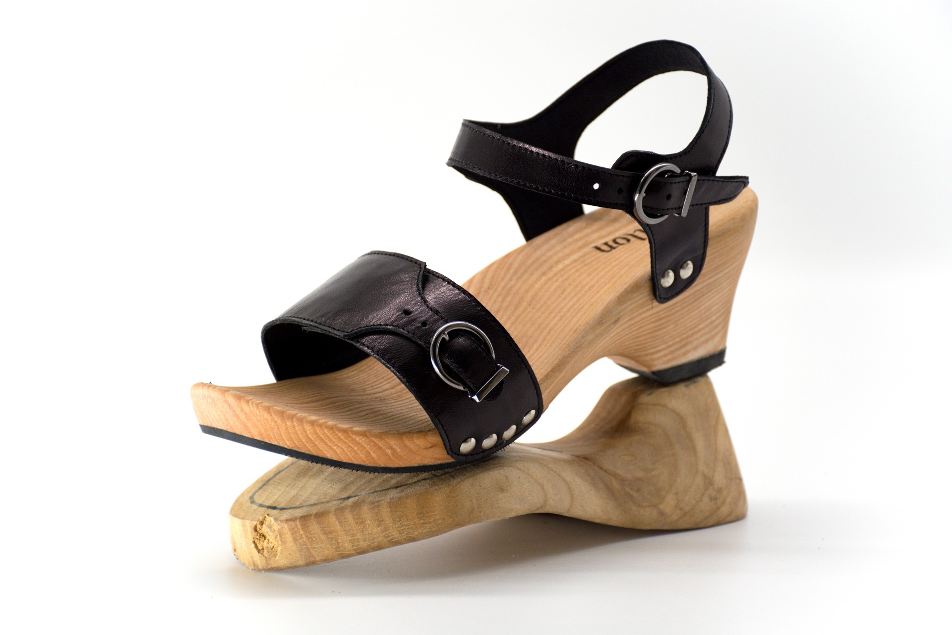 KONSTRUKCE: anatomicky tvarované dřevěné podešve jsou vyráběny na míru každé zákaznici. Bota je doplněna sponou na nártu umožňující zvětšení pásku až o 3 cm: snadné přizpůsobení noze během dne.